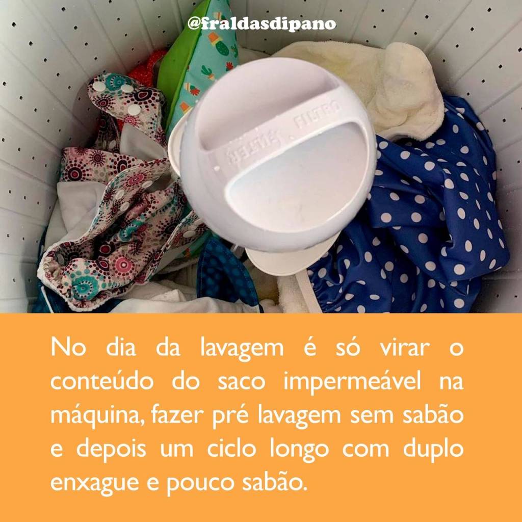 Basta encher novamente a máquina com água e sabão — sempre seguindo as orientações indicadas pelos fabricantes de cada marca de fralda para evitar uma limpeza ineficiente ou um excesso de químicos no tecido que possam causar alergias na pele da criança ou deixar resíduos que possam causar mau cheiro ou até mesmo impermeabilizar os tecidos.