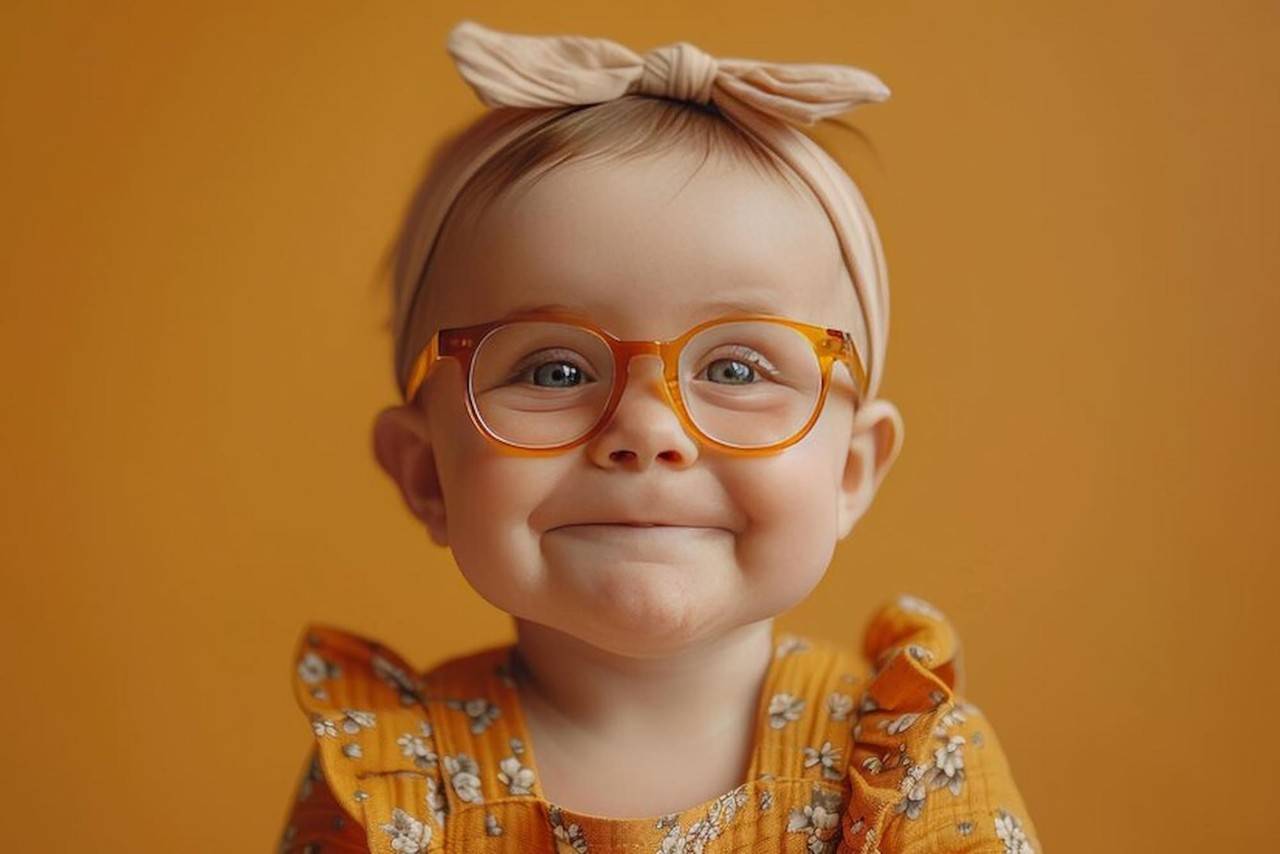 Bebê usando óculos amarelo.